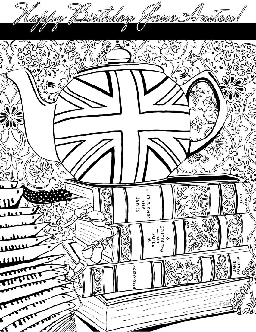 In honor of Jane's 245th birthday, I thought it would be fun to allow you all to download a PDF from my latest release ART, BOOKS, & COFFEE. It is a coloring book filled with bookish things. So you can print it out and relax with a little bit of coloring.